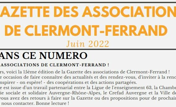 La Gazette des associations de Clermont-Ferrand de juin 2022 est disponible. Consultez la Gazette en cliquant ici.
